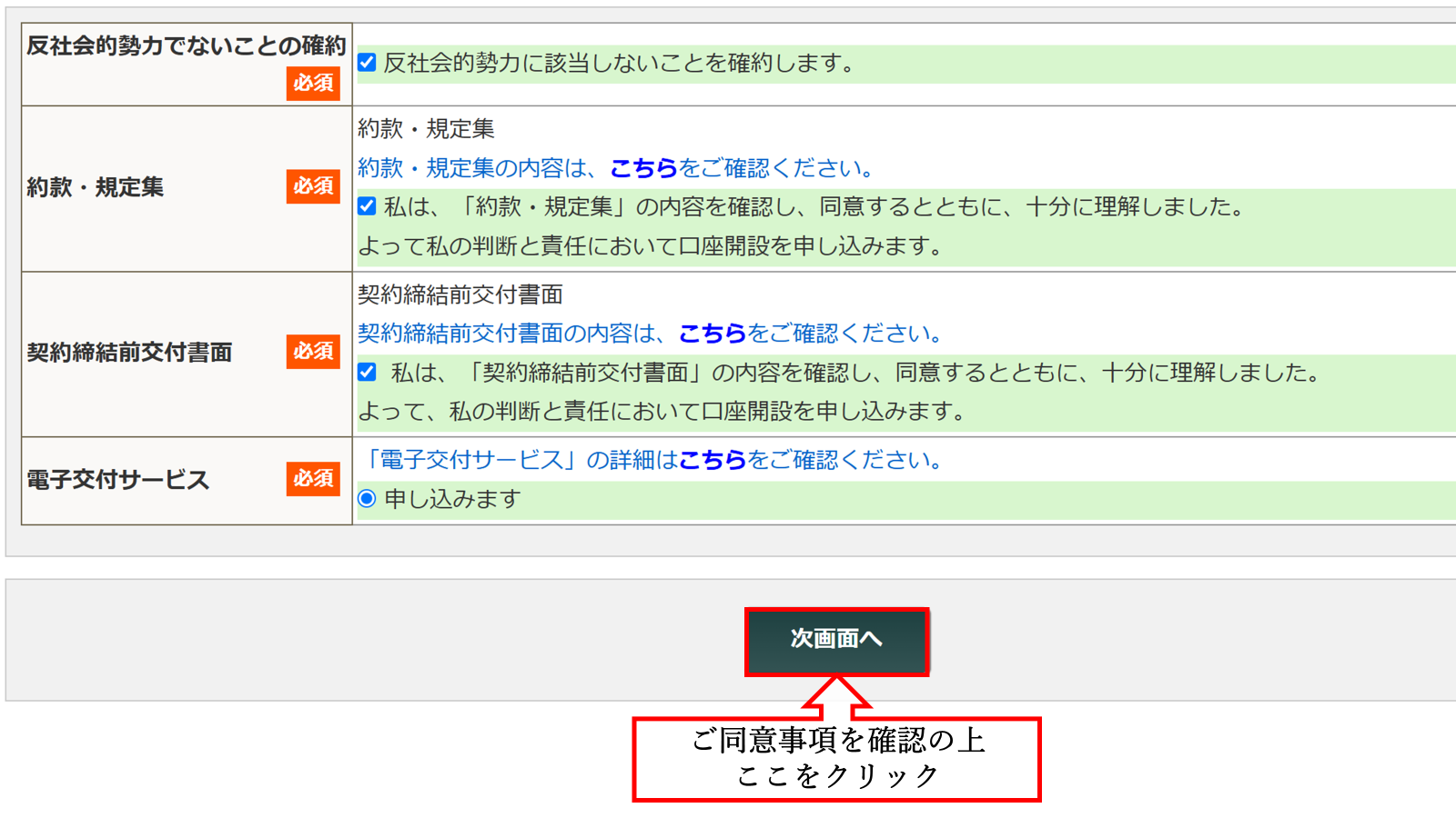 ①ご同意事項を確認の上、[次の画面へ](赤枠)をクリック