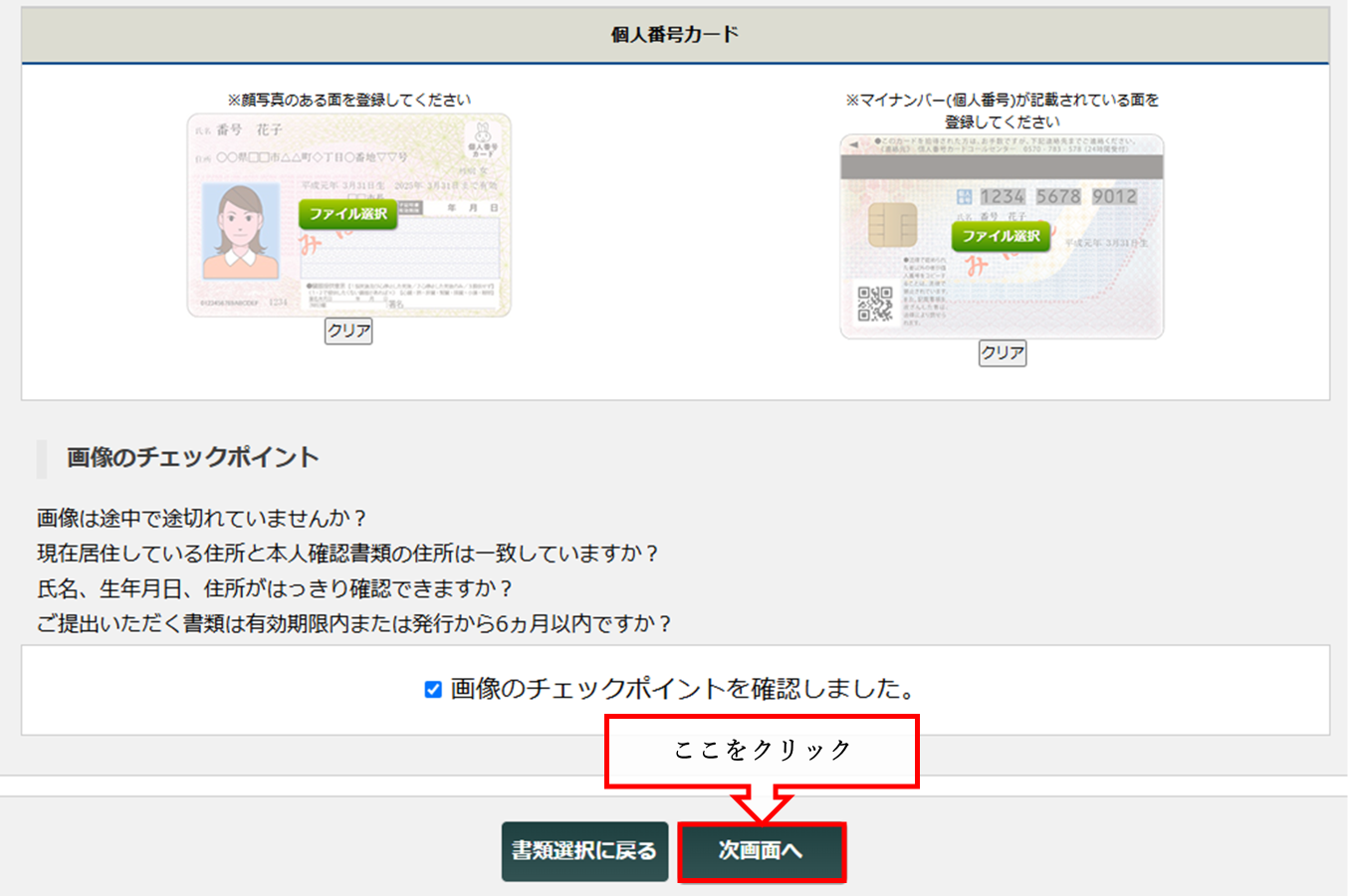 ②マイナンバーの登録を行い、[次の画面へ](赤枠)をクリック
