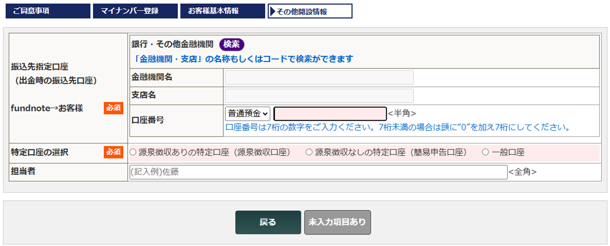 ④その他開設情報(振込先指定口座等)を入力し、口座開設お申し込みは完了になります