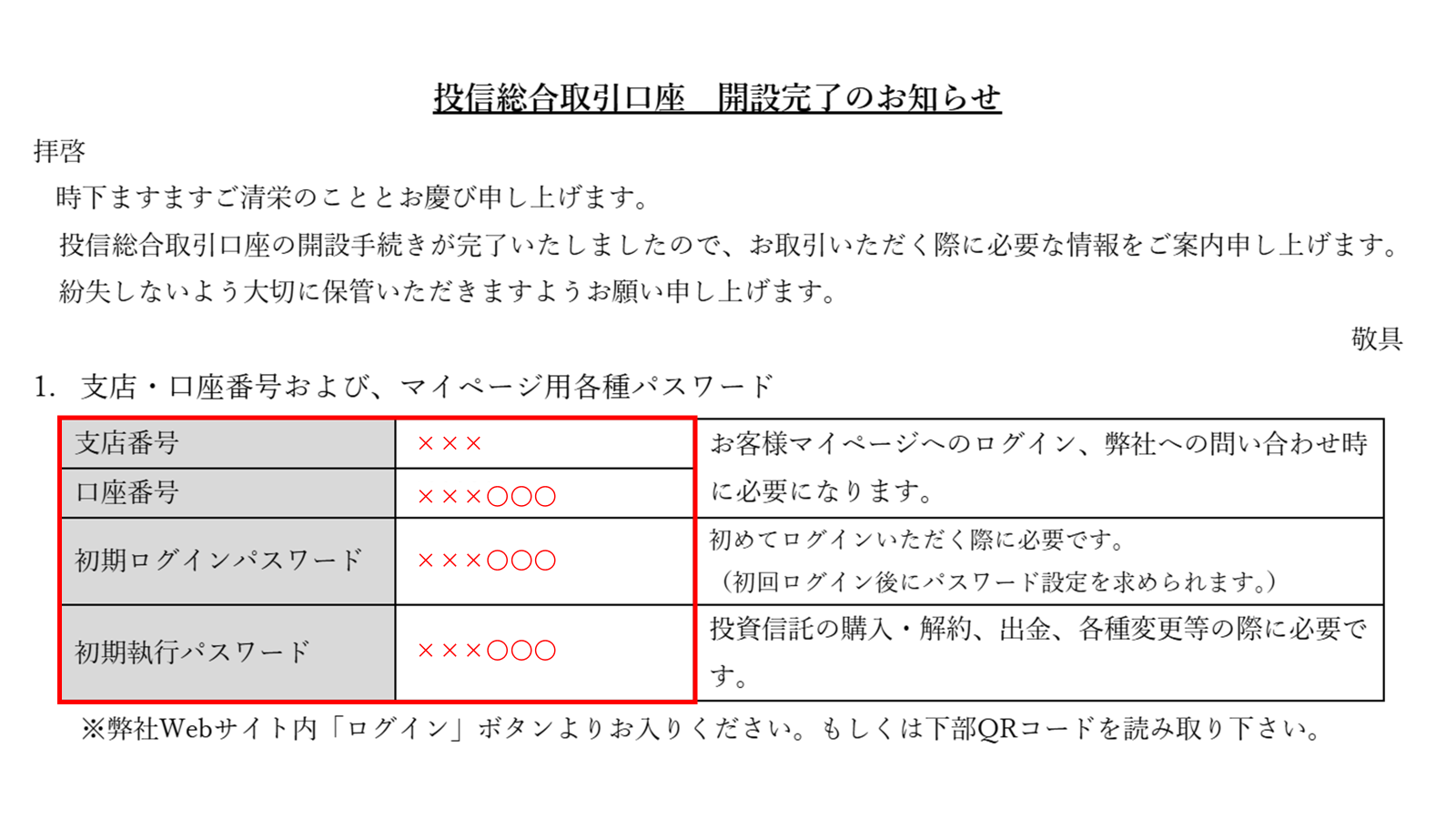 当社HPの「ログイン」ボタンより、口座開設完了通知(郵送)に記載の「支店番号」「口座番号」「ログインパスワード」(赤枠)を入力いただくとマイページにログインできます。