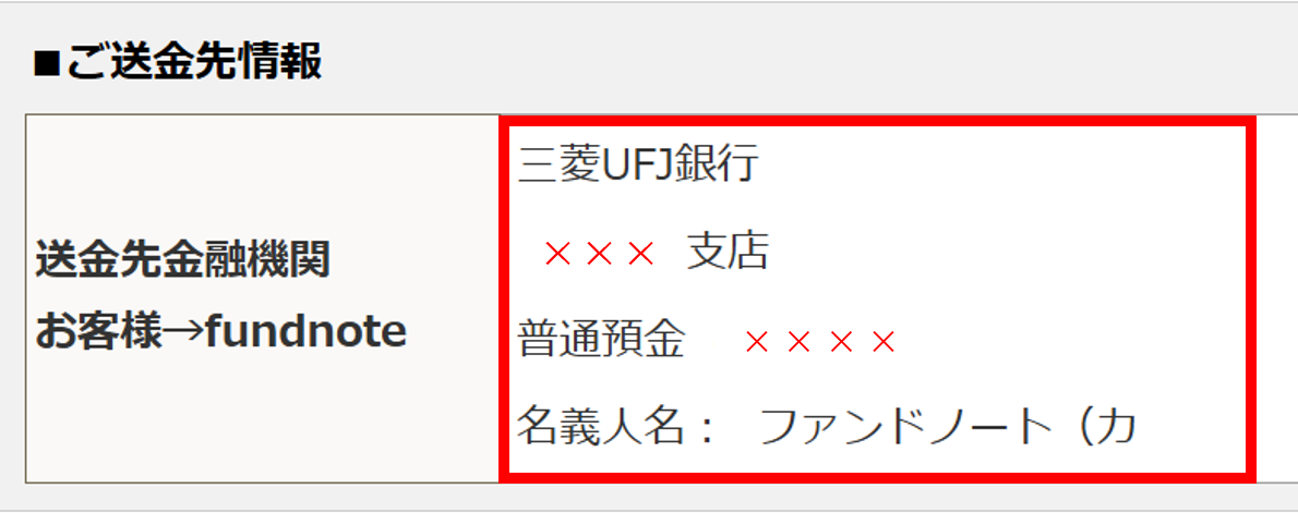 記載の三菱UFJ銀行✖✖支店お客様専用口座宛にご入金ください。